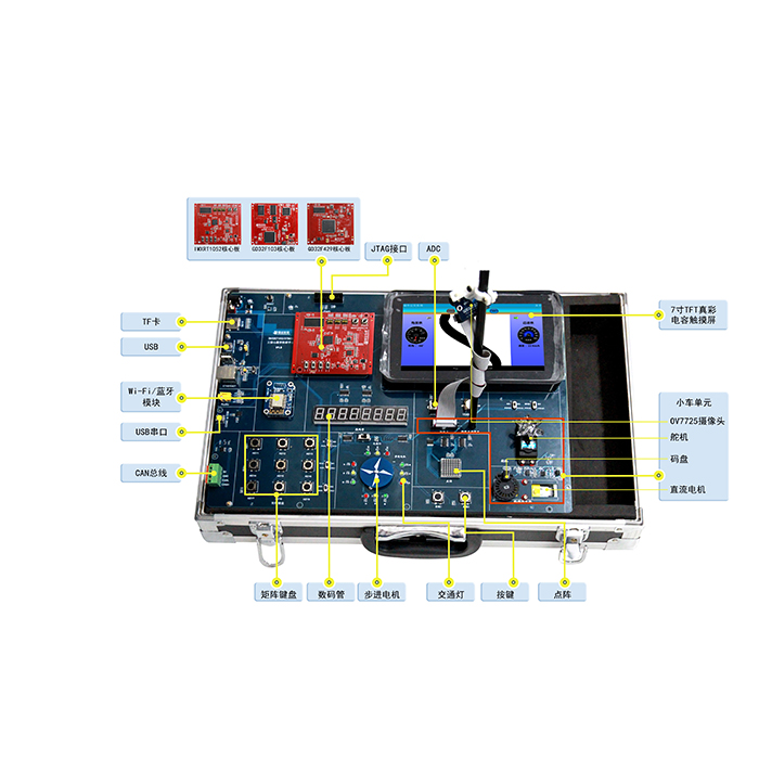 3.板載兼容三款處理器的智能車競賽單元,將真實的智能車拆分至實驗平臺,通過對處理器芯片的編程,結合舵機,直流電機,測速碼盤,循跡攝像頭,ADC電位器以及液晶屏上的滾動賽道等軟硬件資源,實現智能車的轉向,測速,循跡等控制;